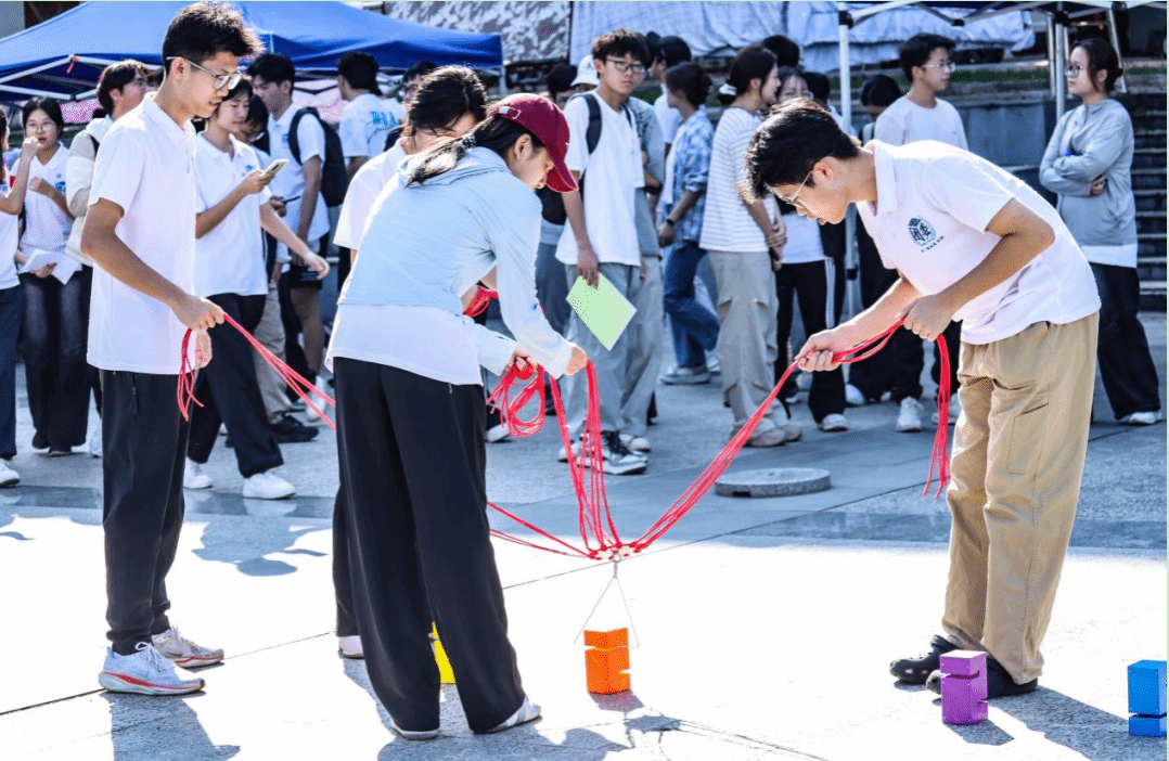 “步步高升”考验团队在吊绳操作下将木盒逐层叠高的耐心与技巧。