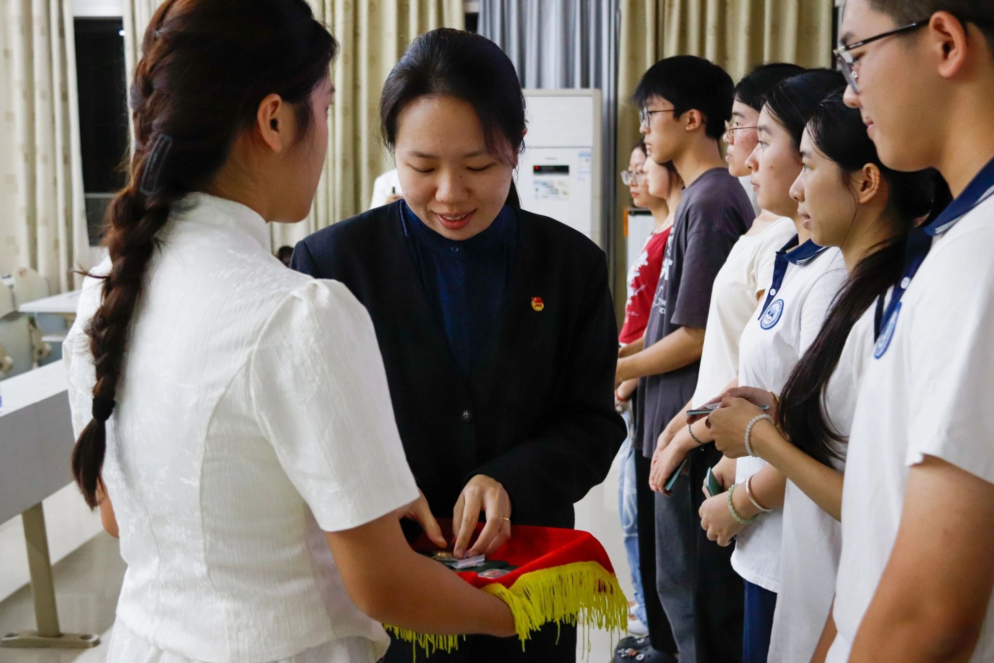 仪式进入最激动人心的环节之一。学院团委副书记李明娴老师与杨金鑫同学为新团员们逐一颁发了团员证和团徽。金色的团徽在灯光下熠熠生辉,它象征着共青团的使命,也承载着党对青年的殷切期望。戴上团徽,意味着从此将团的章程刻在心间,将团员的责任扛在肩头。