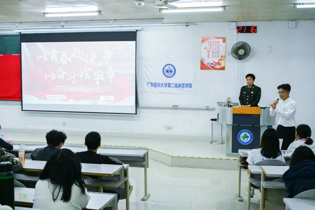 23级口腔医学专业的张杨同学上台为同学们分享了他的军旅生活以及个人的成长与收获。他以一次抗洪抢险活动为例,激励大家积极为国家贡献力量;以担任班助的经历,勉励大家勇担团员责任、传递温暖;以身为组织委员的切身体会,鼓舞团员在服务中强化自身信仰,在实干中实现自我提升;以党的发展对象的身份,鼓励团员筑牢政治立场,坚定理想信念,切实解决实际问题。