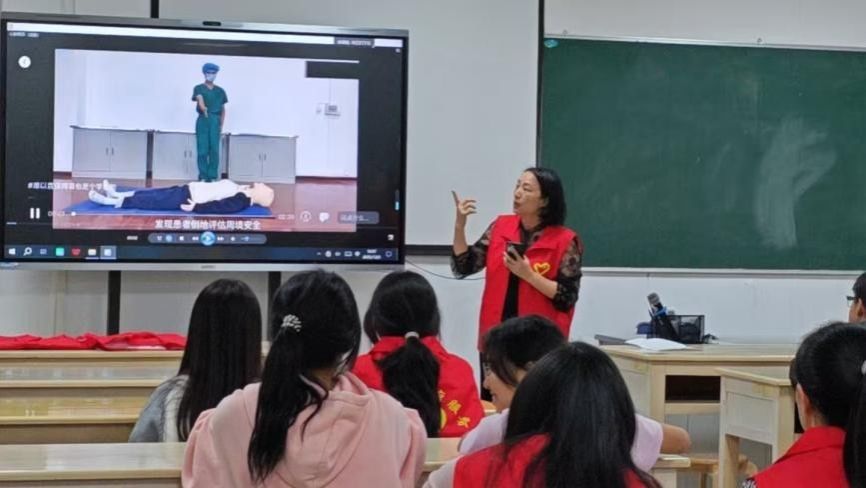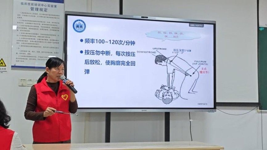 随后,党支部成员以理论结合实操的方式对现场师生开展培训。在理论宣讲环节,韩俏英老师用通俗易懂的语言详细讲解了心肺复苏(CPR)的核心原理、操作步骤以及自动体外除颤仪(AED)的使用规范、适用场景等关键知识,帮助参与者快速建立急救理论基础。