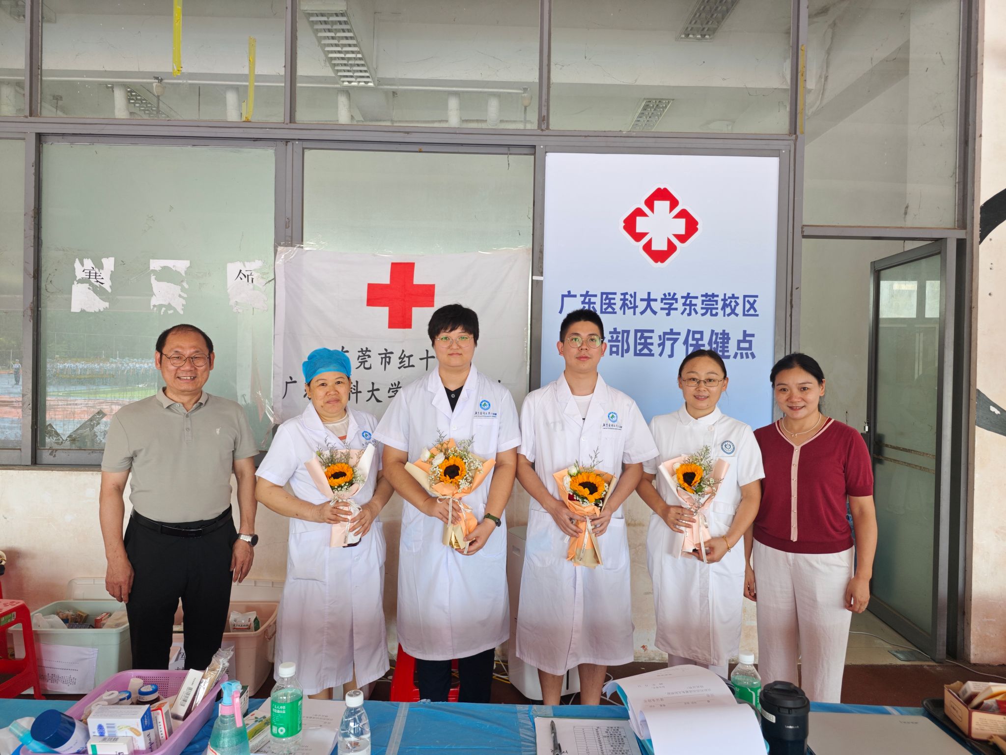 最后,慰问组来到学生军训操场,看望坚守在这里的医务保障人员。"你们在烈日下守护学生健康,用实际行动诠释了医者仁心、师者爱心。"院长将鲜花与礼品送到医护人员手中,叮嘱他们在保障学生健康的同时也要注意自身防护。