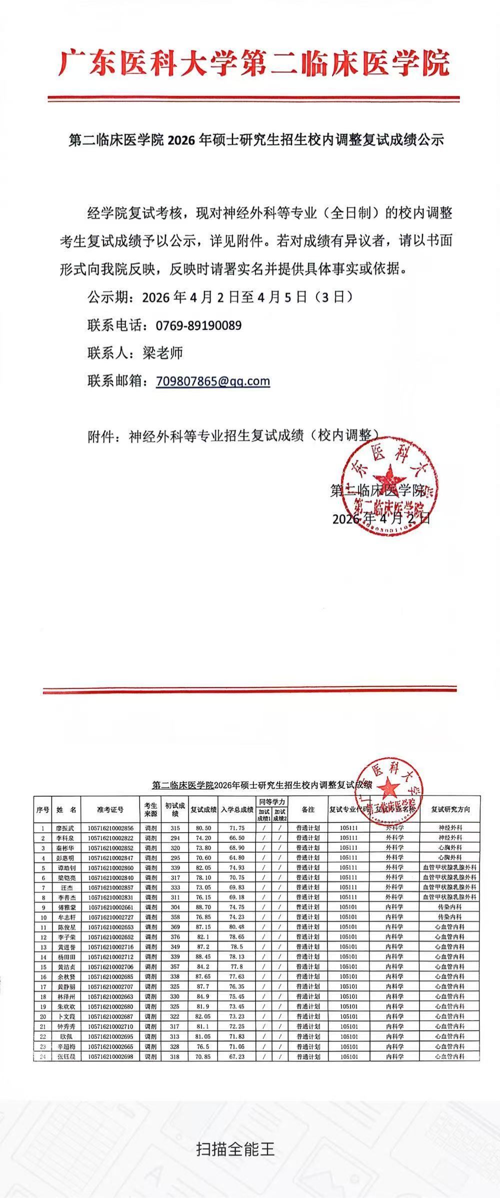 第二临床医学院2026年硕士研究生招生校内调整复试成绩公示